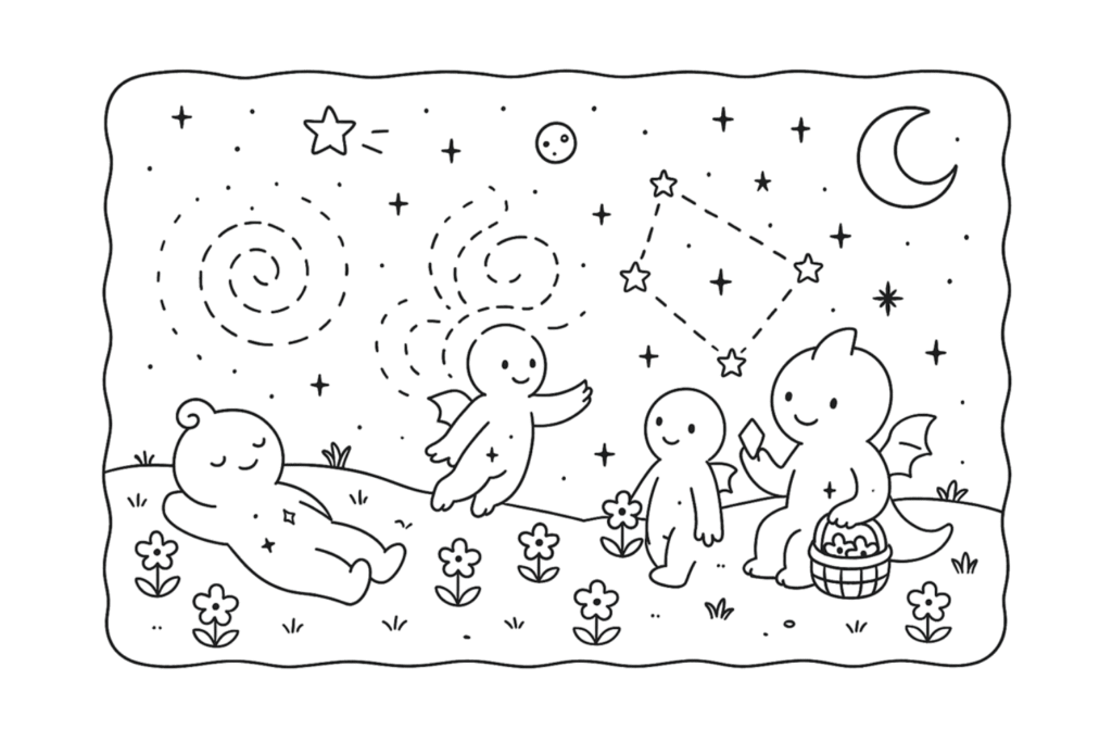Diante dos três caminhos feitos de constelações, Noba, Lilo e Vega se entreolharam. Nenhum sabia qual escolher, mas todos sentiam algo em comum: uma calma profunda.