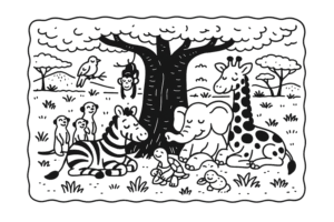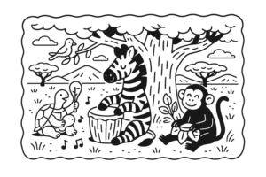 Enquanto caminhava, Zizi ouviu um som ritmado vindo de uma clareira entre as árvores. ...