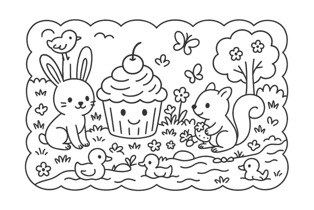 Logo, todos estavam brincando: os patinhos espirravam água, a esquila equilibrava pedrinhas, e o coelhinho corria pela beira. O Cupcake feliz sabia que aquele momento ficaria guardado para sempre, como um dos dias mais alegres da sua vida.